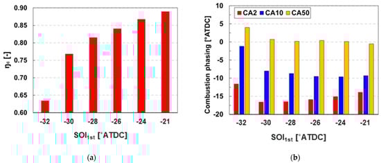 Effect of the start of the first injection timing (SOI1st) on (a) combustion efficiency (ŋc) and (b) combustion phasing (CA2, CA10, and CA50) at Δ1 = 1.