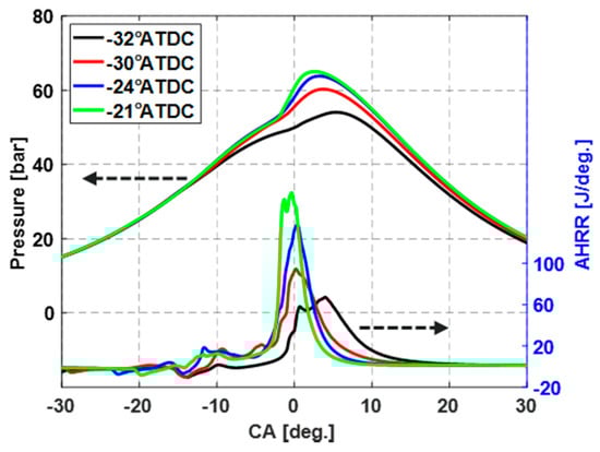 While keeping Δ1 at 1, the SOI1st was varied from −32 to −21°ATDC. Note that the reason for setting the upper boundary of SOI1st to −21°ATDC was to ensure enough spare time before the second injection started. Combustion performance characteristics, including combustion efficiency and combustion phasing, are illustrated in Figure 17. The in-cylinder pressure and AHRR are shown in Figure 18. Overall, as both spark timing and SOI1st were retarded, the combustion efficiency increased progressively to near 90%, and the peak in-cylinder pressure and AHRR also increased. The lower combustion efficiency and more retarded combustion phasing were attained at SOI1st = −32°ATDC. This was because a too early injection resulted in an unfavorable local environment for fuel–air mixing.