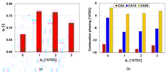 To further evaluate the effect of Δ1, it was varied from 0 to 3 at the SOI1st of −30°ATDC. Figure 19 shows the effects of Δ1 on (a) combustion efficiency and (b) combustion phasing. The highest combustion efficiency and the most advanced combustion phasing were produced at Δ1 = 1, followed by Δ1 = 2, then Δ1 = 3. When setting the sparking timing equal to SOI1st (i.e., Δ1 = 0), due to the lack of localized ignition, the combustion efficiency and combustion phasing remained nearly the same as the one with no spark assistance.
