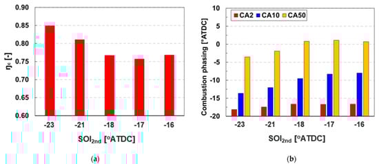 Thereafter, the start of the second injection timing (SOI2nd) was advanced to −23°ATDC regarding the baseline condition (SOI2nd = −16°ATDC), in order to evaluate its effect on the spark-assisted early ignition. Note that the spark timing and SOI1st remained the same as the baseline condition (SOI1st = −30°ATDC; spark timing = −29°ATDC). Figure 20 shows the effect of SOI2nd on (a) combustion efficiency and (b) combustion phasing. The highest combustion efficiency occurred at the SOI2nd of −23°ATDC. This was because the combustion performance benefited from both the early ignition caused by spark-assistance and compression-induced autoignition. When further retarding the SOI2nd, the effect of spark assistance on early ignition was moderated and the autoignition dominated the combustion process, resulting in deterioration of combustion efficiency from 85 to 75%, along with the retarded combustion phasing. As the results presented in Figure 17 and Figure 20 demonstrate, the SOI2nd was less impactful on the combustion characteristics compared to the SOI1st.