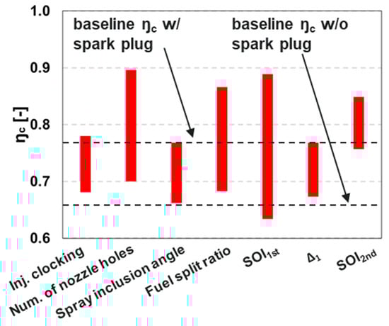 Combustion efficiency exhibited the strongest sensitivity to the SOI1st. Similar to the influence of the number of nozzle holes, the SOI1st impacted both early ignition and the main combustion processes. The effect of fuel split ratio was also notable. As seen in Figure 21, injector clocking, spray inclusion angle, and Δ1 were not as influential as other parameters on the combustion efficiency.