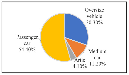 Through real-vehicle tests, 300 sets of overtaking behavior data were obtained, and the overtaking models, overtaking time, and overtaking conflict time were analyzed and counted. The proportion of each vehicle is shown in Figure 2 and the characteristic parameters of overtaking are shown in Table 1.