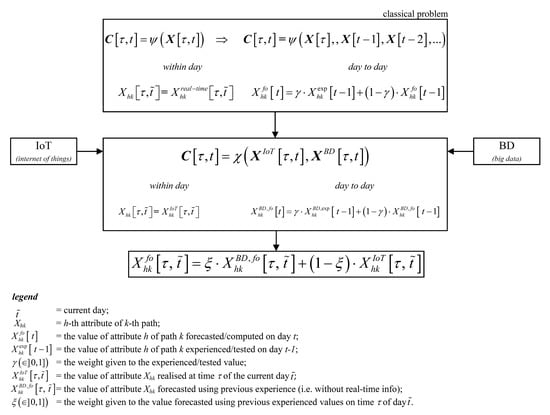 Pointing out the role of emerging technologies (i.e., IoT for obtaining real-time configuration of the network and BD for highlighting the inter-period evolution) in forecasting path attributes, the Equation (1) can be updated as follows: