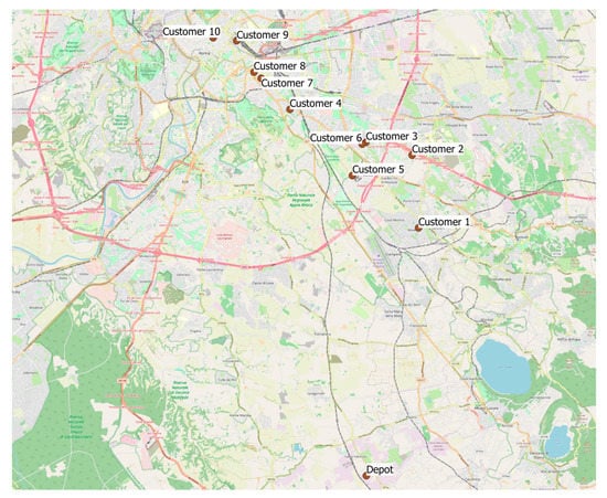Delivery starts from Depot at 9:30, and each customer has a specific service time as reported in Table 1. Using API from Bing and VRP_Spreadsheet_Solver (Erdogan []), the travel time on the real road network has been collected for several working days. Using the average travel times, the best customer sequence has been calculated (Table 2). Referring to a day (e.g., Monday) at time 9:30, the best tour has been calculated and compared with that coming from the average revealed-path travel time and a real-time one. As reported in Table 2, the best tour calculated through Equation (4) is different than that calculated with the average value. Both in Table 2 and Table 3, the first row is the baseline result computed using average values, while the rows below report the results computed using the proposed method. Subsequently, after serving customer 2 (indeed, with average daily travel times, the best sequence suggests a visit to customer 4), at 10:15 using the real-time travel time, the tool suggests visiting customer 1. The suggestions (updated at the end of the current customer visit) from the tool continue until all customers are served. In order to mitigate the random daily effects, as suggested by Equation (3), the real-time information should be merged with that coming from the previous day (average in Table 3; ξ = 0.70). It emerges that the sequence of customers visits differs compared to the average, and it uses only real-time data (Table 2). After, a further research challenge emerges, i.e., to define the best weight to give to past (BD) and current (IoT) values. In fact, using only the past information as shown in Table 2, extra costs that derive from the real-time status of the network can be quite different, e.g., compare average and 9:30 optimal tours in Table 2. On the other hand, specific disruptions can condition tour definition, but they can be solved quickly (network returns close to the average status) and the started tour becomes non-optimal. As emerged from the results of Table 2, according to the network performance evolution, after 11:34 the sequence of visits does not change. In particular, it shows that the sequence (3-6-4-7-8-9-10-D) is quite opposite to the average one, where the last customers are visited as the first ones.
