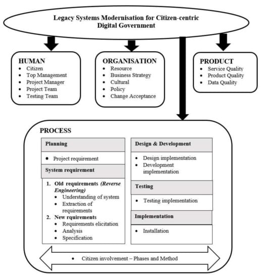 However, modernisation is not an easy task as it involves several aspects including technical, business, organisational, and environmental aspects [17]. Legacy systems in the public sector involve complicated information relationships among other agencies, the culture in the organisation, and the norm environment [10]. Additionally, the needs of the citizens as the main customers of government services should be given high priority [18]. Initiatives towards a citizen-centric digital government show the efforts taken by the government to enhance the use of technologies in providing the best service to the citizens [19]. Thus, service delivery systems that will be developed to support the digital government services need to adopt a more interactive, citizen-centric design and engage the citizens [19,20].