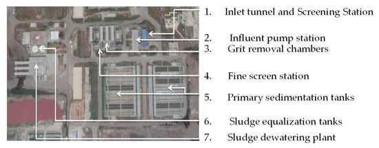 Alexandria Western Wastewater Treatment Plant (AWWWTP) is one of the two main existing WWTPs serving Alexandria. It is located at the western part of Alexandria on the strip of land between Alexandria western harbor and Lake Marriott. AWWWTP discharges primary treated wastewater into Lake Marriott. The proposed upgrade changes the AWWTP from primary treatment with its current capacity of 460,000 m3/day to secondary treatment of 600,000 m3/day to meet the needs up to the year 2050. Figure 1 shows the existing treatment system in Alexandria WWWTP, which includes eight coarse screening channels, eight aerated grit chambers, eight intermediate screening channels (four mechanical screens and four manual screens), and sixteen rectangular primary sedimentation tanks in two batteries. Based on AWWTP laboratory data, the influent wastewater characteristics are shown in Table 1.