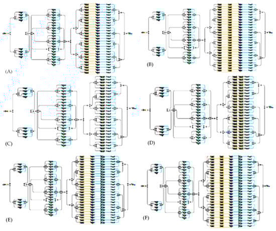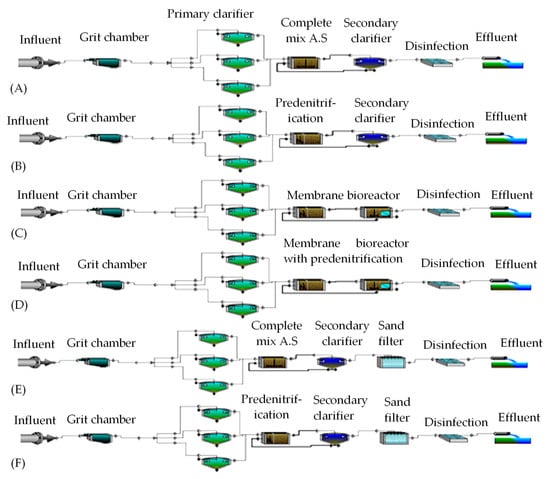 Layouts of the proposed alternatives used in the GPS-X 8.0 program: (A) CAS, (B) CAS-N, (C) MBR, (D) MBR-N, (E) CAS-Sand, and (F) CAS-N-Sand.
