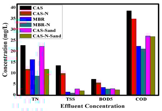 The GPS-X 8.0 simulation program was used to simulate and verify the proposed treatment alternatives’ performances. The effluent concentrations obtained from the process model were compared with the effluent requirements. Figure 4 shows the effluent concentrations in mg/L as obtained from the proposed treatment alternatives using GPS-X 8.0 simulation program. Membrane bioreactor with nitrogen removal treatment alternative has the highest removal efficiencies. The highest concentrations of COD, BOD5, TSS, and TN are 38.71, 7.35, 13.6, and 22.85 mg/L, respectively, obtained from the activated sludge alternative. Effluent quality from the treatment alternatives agrees with the typical effluent quality obtained by Metcalf and Eddy, 5th edition [30]. The COD removal efficiencies of CAS and MBR are 95 and 97%, respectively, which are the same percentages obtained by Valderrama [31]. The COD, TSS, and TN removal efficiencies of MBR are 97, 99, and 60%, respectively, which are similar to those obtained by Bertanza [32]. The COD and BOD removal efficiencies by tertiary sand filtration from CAS-Sand and CAS-N-Sand alternatives are 30 and 56%, respectively, which are in the range obtained by Hamoda [33]. The BOD and TSS effluent concentrations obtained from the treatment alternatives are in the range of 2.5–7.35 mg/L and 1–13.6 mg/L, respectively, which are lower than 15 mg/L (accepted for the Egyptian code for reuse of treated sewage water in irrigation and use of sludge in agriculture 501/2015).
