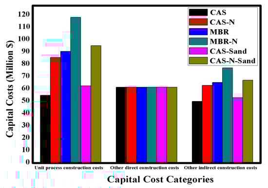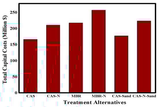 The capital costs in the CapdetWorks 4.0 program were estimated in three categories, i.e., unit process costs, other direct units’ costs, and other indirect units’ costs. Figure 5 provides a comparison of those costs for the six proposed treatment alternatives. The unit process costs of MBR are about 1.7 the CAS costs; this may be attributed to the additional costs of membranes, pumps, and blowers, which match the results obtained by Bertanza [32]. Mobilization, site preparation, site electrical, yard piping, instrumentation and control, lab, and administration buildings are the elements of the ‘other direct construction costs’ category. The ‘other direct construction costs’ category is the same for the six proposed treatment alternatives because all its constituent elements are equal. Figure 6 shows the total capital costs of the treatment alternatives. Costs of the treatment alternatives with anoxic tanks are about 1.25 times the cost without anoxic tanks, which is close to the percentage obtained by Arif [18]; this may be attributed to the additional construction costs of the anoxic tanks.