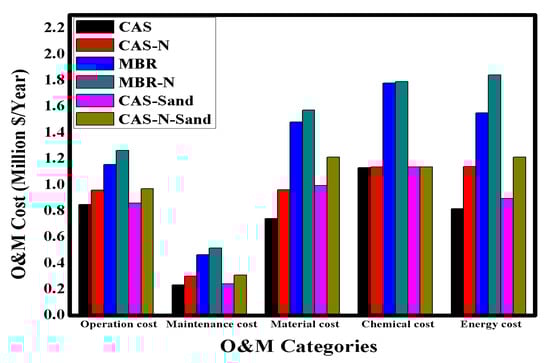 The annual operation and maintenance cost categories in CapdetWorks 4.0 are operation labor (administration, laboratory, and unit process operation labor cost), maintenance labor, energy, chemicals, and materials. Figure 7 provides a comparison of the treatment alternatives based on the O&M cost categories. MBR provides the highest energy costs due to the higher energy consumption of the membrane pumps than those used in the CAS. MBR is higher than CAS and CAS-sand systems in terms of the O&M labor costs because MBR is a sensitive technology that requires qualified labor. The MBR system is highly influenced by contaminants contained in the feed water, which can produce various forms of fouling [18,39].
