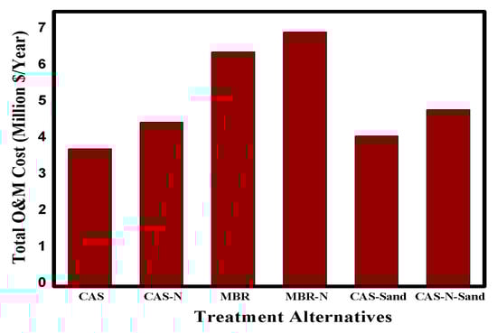 The total costs of operation and maintenance are shown in Figure 8. The operation and maintenance costs of systems with membrane filtration are higher than those without membranes due to the costs of the membrane replacement, chemicals required for membrane cleaning, higher energy usage, and more operation and maintenance labor required for MBR. The total operation and maintenance cost of MBR is about 70% higher than CAS, which is similar to the percentages obtained by Bertanza [32] and Smith [40].