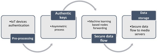 On the other hand, the encrypted blocks, , at media servers, first decrypted by using the public key of sink node for verifying their authenticity, and later recover the original data by using the private key of the media server. Figure 1 depicts the components of the proposed framework. Initially, IoT devices perform authentication processes for verification and distributing authentic keys by using asymmetric cryptosystem. After being validated, the proposed framework executes the process of data flow for routing and maintaining communication paths efficiently, along with the management of data security. Moreover, the data flows are updated by using the intelligent method of machine learning and imposing minimum overheads. All the components are interrelated with each other to attain a sustainable environment for multimedia applications.