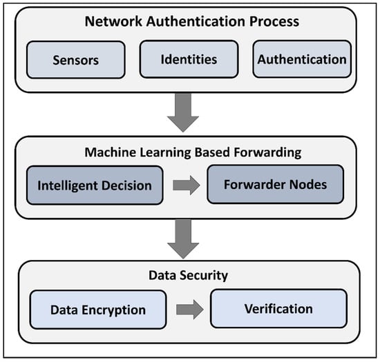 Figure 2 illustrates the block diagram of the proposed framework. It has four main phases. In the beginning, the IoT network is initiated in all the devices and sensors to collaborate and exchange their identities. Once they authenticate and verify their ID, then the IoT network can move to the next stage. The asymmetric algorithm is utilized by the proposed framework for generation and distribution security keys. Moreover, the machine learning technique is exploited by the proposed framework for the selection of forwarders and maintaining consistent routing paths with nominal overheads. Moreover, edge nodes collaborate with IoT networks and sink node to manage the network resources efficiently and decrease the data delay with different applications.