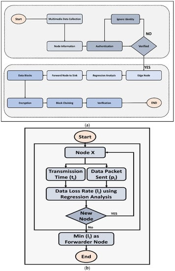 Proposed framework for authentication of multimedia traffic, along with machine learning forwarding. (a) Process diagram of proposed multimedia devices’ information, authentication, and security. (b) Process diagram forwarder selection, using machine-learning-based regression analysis.
