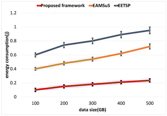 Evaluation of energy consumption with varying data size between proposed framework and existing solutions.
