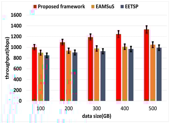 Evaluation of throughput with varying data size between proposed framework and existing solutions.