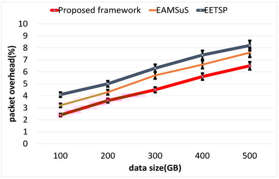In Figure 8, the proposed framework evaluates the packet overhead in comparison to the existing solution. It has been observed that the proposed framework reduces the overhead by 35% and 44% when compared to other work. It is due to the use of the regression-based machine learning technique for forwarding node selectors that allows efficient transmission of data between the neighboring nodes toward the sink node. The node selection process is accomplished based on the stored data about the packet loss rate of each neighboring node. In contrast to EAMSuS, the proposed framework generates and distributes the security key in a lightweight manner by using the capabilities of network edges. It improves the security system among direct and partially connected devices and lowers the packets overheads while verifying the constraint nodes. Furthermore, the proposed framework enhances the security of the network by adopting multi-hop authentication and encryption protocol, which not only avoids exploitation of the network resources through unauthorized access but also keeps them from broadcasting the data toward targeted nodes.