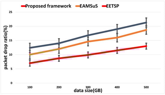 Evaluation of packet drop ratio with varying data size between proposed framework and existing solutions.