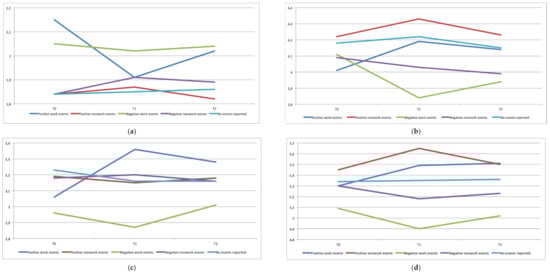 For perceived stress at work, results indicated a nonsignificant mean-level change in perceived work stress between T0 and T2 (see Table 2). The moderation analysis indicated a marginally significant interaction effect between the time and type of event. The interaction effect, although marginally significant, showed a significant quadratic effect, F(4, 665) = 2.57, p = 0.037. We found also a main effect of the type of event. All interaction effects are represented in Figure 1. As illustrated in Figure 1a, only facing positive significant work events seems to have a positive effect on perceived stress at work but only on a short-term basis. Negative work or nonwork events were not found to increase the level of perceived stress at work.