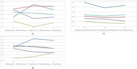 Growth trends in health, happiness and productivity indicators in the four different types of significant major life event experiences: (a) Growth trends in work stress rated on a 5-point Likert-type scale, (b) growth trends in self-rated health rated on a 5-point Likert-type scale, (c) growth trends in job satisfaction rated on a 4-point Likert-type scale, (d) growth trends in life satisfaction rated on a 7-point Likert-type scale, (e) growth trends in perceived quality of life rated on a 5-point Likert-type scale, (f) growth trends in employability rated on a 4-point Likert-type scale, and (g) growth trends in career prospects rated on a 4-point Likert-type scale.