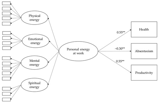 SEM model of total construct of personal energy at work and the relationship with health, absenteeism and productivity. ** p < 0.001.
