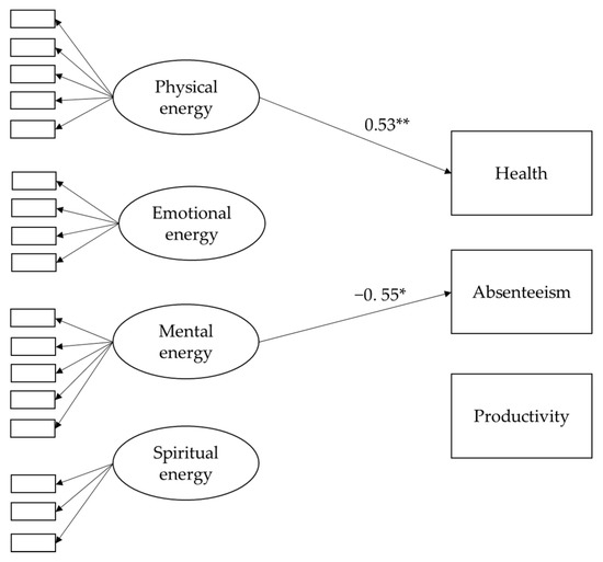 Trimmed SEM model of personal energy dimensions and the relationship with health, absenteeism and productivity. ** p < 0.001, * p < 0.05.