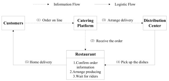 Figure 1 shows that online ordering is treated as a chain of processes, similar to a supply chain. Online ordering involves preparation and delivery. The process starts when an order arrives. The restaurant needs to receive the order in time and schedule the preparation of dishes. The courier will then pick up the prepared dishes and deliver them to corresponding customers. Existing practical and academic research pays particular attention to the delivery process. For instance, takeout route planning models and continuous optimization of algorithms are studied in order to improve the efficiency of delivery processes. To ease the tension of transportation capacity, part-time couriers convene through crowdsourcing and are added to the distribution system during peak hours. To ensure the speed of distribution and sufficient capacity, the takeout platforms are devoted to finding an appropriate reward system. These efforts contribute to the efficient capacity of the delivery process. However, compared with the delivery process, the food preparing process is harder to adjust during peak periods because of poor flexibility. The outbreak of COVID-19 left a huge impact on people’s daily lives. The increasing online takeout need leads to the constant consideration of waiting time for consumers. A survey on the “external factors affecting the delivery time of takeout couriers” for couriers showed that “slow meal preparing speed of merchants” was on the top of the list, at 70.27%; this result shows that this item is the most critical factor that affects order completion time [1]. Additionally, restaurants are facing double pressures from online orders and in-store costumers. If online orders cannot be completed on time, the restaurant will not only be pressured and face complaints from couriers and online customers, but they also run the risk of losing in-store customers with the dropping service expectations. Therefore, focusing on the food preparation process is critical to increasing the sustainability of the whole industry.