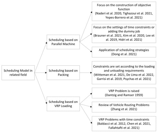 The scheduling problem bears similarity with VRP. This classic problem was raised by Dantzig and Ramser [16] in 1959, with abundant research results. The existing related modeling and algorithm can be used for reference. Zhang et al. [17] reviewed the research on the VRP and pointed out that the VRP model can be used to optimize the economy or a service under certain constraints while serving all demand points. In a study with delivery time as the constraint, Baldacci et al. [18] examined a distribution service with a hard time window, which means that the arrival time must be within a limited time range. A fleet of m identical vehicles of capacity Q is stationed at the depot and these could fulfill customer demands. Chen et al. [19] also defined the different types of time when studying the robot workshop handling problem with the time window. Fallahtafti et al. [20] dealt with the selective pickup and delivery problems of a multi-stage network supply chain. The authors appropriately modelled time slot allocation to that of trucks by considering the type of trucks, arrival time to the plant warehouse, number of time slots required for unloading, and availability of warehouse time slots.