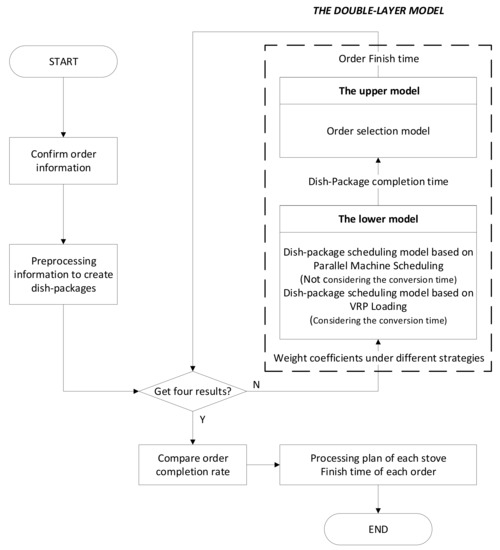 The logic of the double-layer model is shown in Figure 3. After confirming the order information and preprocessing the dish-package, the restaurant can schedule the cooking plan with four different scheduling strategies. The upper model calls the package scheduling data from the bottom layer model. Finally, the optimal model is obtained after comparing the actual results using these strategies. Notably, the weight value method given in Table 1 is an approximate scheme for the optimal goal, wherein the final decision should be obtained only after four attempts.