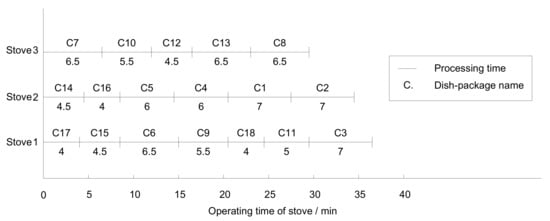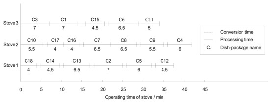 This problem is essentially similar to VRP if the switching time between the dish-packages is considered. First, each dish-package is assumed to be a customer, and the processing time of the dish-package is the loading and unloading time of the goods at the customer’s location. Second, the stoves can be likened to the vehicles in a VRP model. The meal scheduling of the dish-packages focuses on where the dishes are cooked and in what sequence. This situation is similar in VRP, which also focuses on how customer demand is satisfied with optimal vehicles and sequences. Third, the switching time of the packages is similar to the transportation time in the VRP problem.