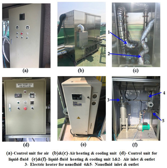 A photograph of a dual-fluid PV/T system with a single pass air channel is shown in Figure 1. The complete experimental setup mainly comprises a mono-crystalline PV module, experimental data monitoring and recording units, nanofluid and air circulation systems, heating and cooling units for both fluids, and a storage tank for the nanofluid (Figure 2). In order to maintain constant inlet temperature, a heating and cooling unit consisting of a chiller and heater was provided separately for nanofluid and air, respectively, so that outdoor performance testing of the dual-fluid PV/T system could be performed according to ISO standard operating conditions. As generally done previously, the researchers used a secondary tank to discard the heated fluid from the PV module with the intention of keeping the inlet fluid at nearly constant or fixed temperature. Using this method, a lack of accuracy was the prime concern. In this study, the test facility is equipped with heating/cooling units for both liquid-type and air-type heat transfer fluids, where the desired inlet temperature ranges can be selected using switch gear panels. Labeled pictures of the heating and cooling units for both fluids and control panels are shown in Figure 3. The preference of outdoor testing over indoor testing stems from the following: when the PV/T system is tested under tungsten halogen lamps or a simulator, a clear discrepancy was observed between the electrical characteristics measured by the indoor test and those given by the manufacturer [13]. This may be attributable to a stronger infrared portion and weaker blue and UV portions in the artificially produced spectrum.