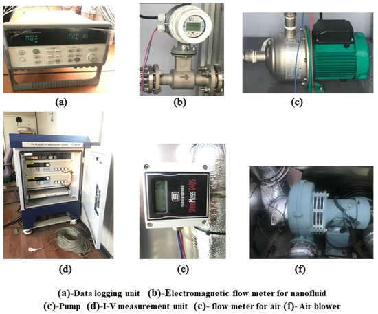 For the energy performance evaluation, a prototype of the dual-fluid PV/T system was built and tested under outdoor conditions at Cheonan city, South Korea. The surface temperatures of the top and back of the PV panel were measured using K-type thermocouples. A total of eight temperature sensors solely for the PV module were used, where three of them were placed at its top surface, and the remaining five were attached at the rear surface. Three temperature sensors were installed respectively at inlets and outlets of both fluids. Prior to experimentation, all temperature sensors were calibrated as per ISO standard conditions. A first class pyranometer was installed parallel to the PV module to measure the global solar radiation. The nanofluid from the storage tank was pumped into the serpentine-shaped pipe heat exchanger by a pump, and air was circulated through the air channel by two air blowers (at the inlet and outlet) driven by an AC motor. The nanofluid flow rate was measured by an electromagnetic flow meter (FD Flow Digital), and the air flow rate was recorded by an insertion gas mass flow meter (SteelMass 640S). The speeds of both fluids, the nanofluid and air, were controlled using power regulators. The wind speed and direction were measured with a weather station installed near the experimental setup. Details of equipment used to control operational conditions are presented in Figure 4.