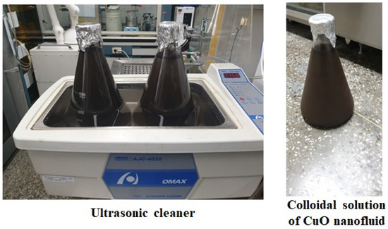 In this study, copper oxide (CuO) nanoparticles were employed in powder form as supplied by a local supplier (HKK Solution). The size of the nanoparticles varied between 10 to 25 nm. Specifications of the CuO nanoparticles are presented in Table 3. Proper suspension of nanoparticles in a base fluid (distilled water) is very important to obtain a stable colloidal solution, and also to improve the thermal conductivity of the resultant solution. Prior to mixing, nanoparticles were put in an oven for an hour at 200 °C to remove existing moisture. Using an electronic balance, the desired mass of CuO nanoparticles was weighed. For nanofluid preparation, a two-step method was adopted here. Using a magnetic stirrer, sodium dodecyl sulfate (SDS) in a quantity of 5% weight of CuO nanoparticles was mixed completely in deionized water, and then the required amount of nanoparticles was added while stirring. An ultrasonic cleaner (OMAX AJC-4020) was used for the preparation of the nanofluids (Figure 5). The aforementioned mixture was further sonicated for 12 h to obtain 12 L of colloidal solution. The mass required for a particular volume concentration in the test sample of base fluid was calculated using the law of mixtures in terms of percentage of volume fraction [28], density of CuO nanoparticles, and density of deionized (DI) water base fluid using the following relationship: