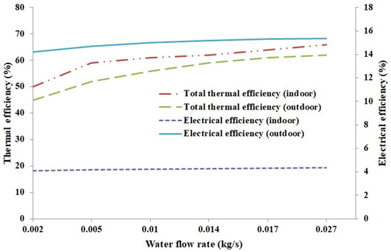 Under indoor experimental conditions, the solar simulator produces a light that has color temperature of 3400 K or less, while the actual color temperature of the sunlight spectrum is 5900 K. Therefore, the transient temperature responses across the collector components can only be evaluated precisely when the system is subjected to outdoor testing conditions. Therefore, the outdoor performance tests of a dual-PV/T system were carried out in comparison with indoor test conditions. Indoor test data for an identical system published by Jarimi et al. [13] was considered for comparison. Figure 6 shows the indoor and outdoor experimental analysis of the dual-PV/T system during simultaneous operation of water and air under a radiation intensity by solar simulator of 700 W/m2, and by sunlight of 700 ± 50 W/m2. Following the similar operational conditions, the water flow rate increased from 0.002 kg/s to 0.027 kg/s at constant air flow rate of 0.026 kg/s. The indoor and outdoor experimental total thermal efficiency increased from 50% to 66% and 45% to 62%, respectively, while indoor and outdoor electrical efficiencies increased from 4.1% to 4.36% and 14.2% to 15.3%, respectively. A significant discrepancy between indoor and outdoor test findings was observed in particular in electrical efficiency, even though the given data curves follow a similar pattern, but the difference between indoor and outdoor data was found to be notably high. As expected, due to weaker blue and UV radiation portions in light produced by indoor solar simulator, the electrical characteristics were greatly affected. Thus, results in a lower electrical efficiency, meanwhile, the outdoor thermal efficiency was slightly higher than that of indoor thermal efficiency of the dual-PV/T system.