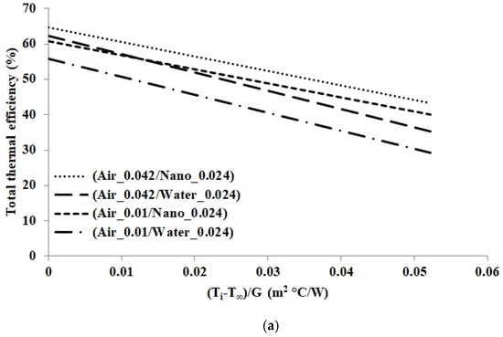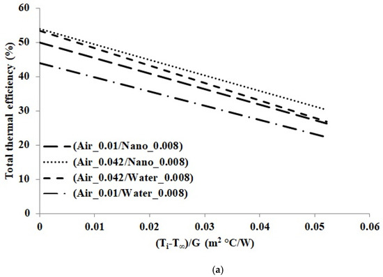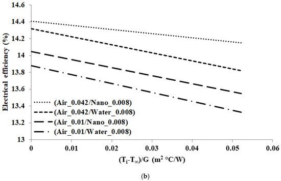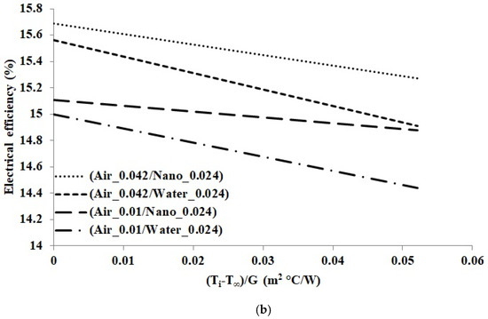(a) Total thermal efficiency; (b) electrical efficiency at reduced-zero temperature for variable air flow from 0.01–0.042 kg/s at fixed nanofluid or water flow of 0.024 kg/s.
