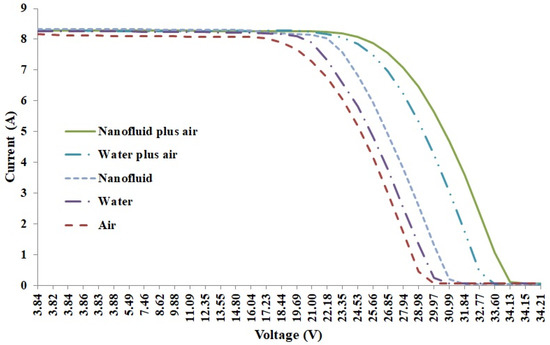 In order to analyze the real time performance of a dual-fluid PV/T system, the daily variations of the electrical characteristics such as short circuit current, open circuit voltage, current, and voltage at the maximum power point were recorded during experimentation. Generally, voltage is more affected by the PV layer temperature than current is; therefore, utilization of different modes of fluid operation for the cooling of PV solar cells generates different electrical power outputs. The average temperature of the PV module and electric current vary directly with the irradiance, whereas the open circuit voltage decreases as the average temperature of the module increases. For the same irradiance of 850 W/m2 with a maximum deviation of 50 W/m2 and fixed air and water or nanofluid flow rates of 0.04 kg/s and 0.024 kg/s, respectively, the effects of simultaneous and individual fluid operations on the electric current and power are presented in Figure 9 and Figure 10. In the case of the dual-fluid as a coolant, increases in the open circuit voltage and electrical power were observed; however, the nanofluid in combination with air provided marginally better performance than water plus air. The aforementioned improvements in voltage and power in particular for the nanofluid plus air can be interpreted as a reward of smaller parasitic resistance. Therefore, an increase in the open circuit voltage will result in an increase in the maximum power point. These positive changes may also be associated with temperature uniformity across the PV module. It is concluded that the dual-fluid heat exchanger is an effective electricity enhancement technique, but the nanofluid plus air provided the highest value. This is attributed to the larger surface area of the dual-fluid and the superior thermo-physical properties of the nanofluid. Most importantly, the nanofluid performs even better under high operating temperature.
