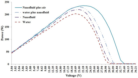 Power-voltage curves for different flow combinations at fixed air and water or nanofluid flow rates of 0.04 kg/s and 0.024 kg/s, respectively.