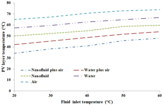 Generally, the thermal conductance between the PV layer and absorber metal plate is solely dependent on the thermal conductivity of the adhesive or silicon paste used to attach them directly. However, the selection of appropriate circulating fluids and correct operating conditions are also equally important in the context of extracting accumulated heat from the PV and absorber layers. Under a wide range of outdoor conditions, the PV temperature can be used to assess the heat conductance rate across the PV/T system. The measured PV temperatures using nanofluid plus air, water plus air, nanofluid, water, and air were plotted against fluid inlet temperatures, as shown in Figure 11. As expected, using simultaneous fluid operation, the PV layer temperature was lower compared to the results obtained with single-fluid-based coolants. However, the PV/T system with nanofluid/air coolant showed a lowest PV temperature that is almost 12 °C lower than that of the air type PV/T system. A low PV temperature brings about further benefits such as improvement in electrical efficiency and mitigated long-term performance reduction.