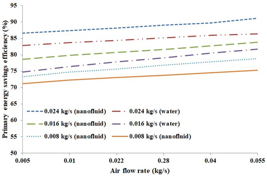 Primary energy savings efficiency when the air flow is set to vary between 0.005 to 0.055 kg/s at fixed nanofluid or water flow rates of 0.008 kg/s, 0.016 kg/s, and 0.024 kg/s.