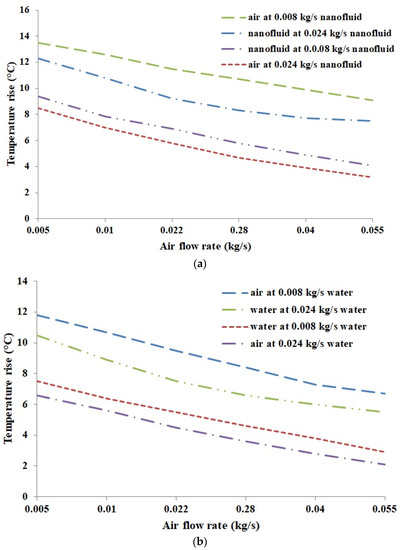 Temperature rises of (a) nanofluid/air & (b) water/air when air is circulated ranges from 0.005–0.055 kg/s at fixed nanofluid or water flow rates of 0.008 kg/s and 0.024 kg/s.