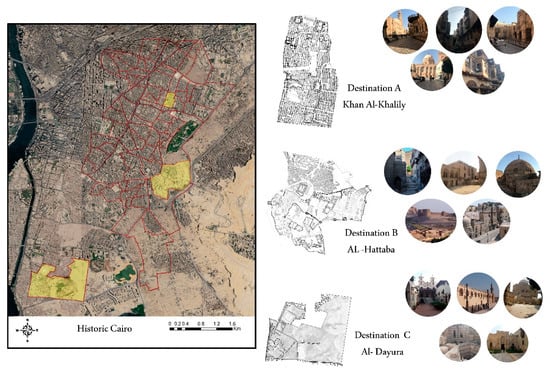 The boundaries of historic Cairo with the distinction of the three destinations selected for the pilot study. Source: Authors—based on [54,55,56].