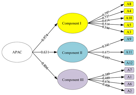 Component I consisted of five APAC indictors: A3, A4, A5, A8, and A10 with the component-based factor weight scores of 0.522–0.779. Component II consisted of three APAC indictors: A9, A11, and A12 with the component-based factor weight scores of 0.509–0.784, and Component III contained four indicators: A1, A2, A6, and A7 (0.428–0.763).