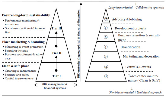 The upward hierarchical structure of services provided by BIDs. Source: authors based on Gopal-Agge & Hoyt [56], Yanchula [58] and Coca-Stefaniak & Carroll [66].