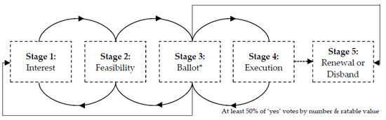 The stages of Business Improvement District development. Source: authors based on Grail et al. [29] and Cotterill et al. [30]. * At least 50% of ‘yes’ votes by number & ratable value.