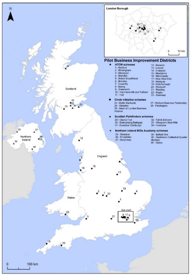 While there are variations in BIDs’ regulations in each devolved nation—such as the need for a minimum 25% ballot turnout in Scotland and Northern Ireland and the possibility for both property owners and occupiers to finance the BIDs in Scotland (in England, Wales and Northern Ireland, only business occupiers are levy-payers, although some exceptions exist)—forming a BID is strictly dependent on the approval of the business plan in a ballot [73,74,75,76].
