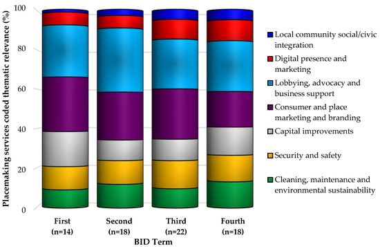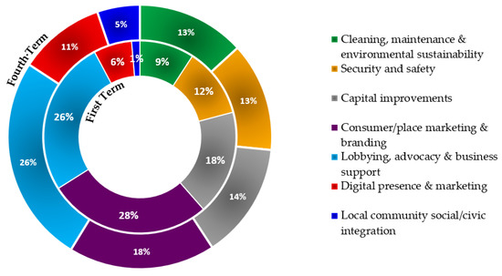 In drawing this study to a close, the results of this paper make six important contributions both to the place management and BID-related literature and to place management practitioners, in particular BIDs’ managers. The first contribution is that UK BIDs have not strongly prioritized basic placemaking services, such as ‘clean, green and safe’, in their early operations. While none of these three categories was the most relevant when analyzed independently, the empirical analysis has also shown an increase in the thematic relevance of ‘clean, green and safe’ services in fourth-term BIDs due to the rise of environmental sustainability issues. Therefore, these results do not support insights from existing North American-centric BID literature which has broadly argued that cleaning, maintenance and security services, in addition to shape the main early priorities of most place management organizations, tend to experience consecutive thematic reductions over time [53,56,58]. These differences may be due to, on the one hand, the time gap between the flourishing of BIDs in the US and the UK, so that the original basic needs of town centers were different. On the other hand, it may be the case that local government involvement in the UK is more effective and efficient in the delivery of statutory services, such as urban cleaning/maintenance, so there is no such substantive need for the BID to strongly invest in these kinds of services [26,49,72].