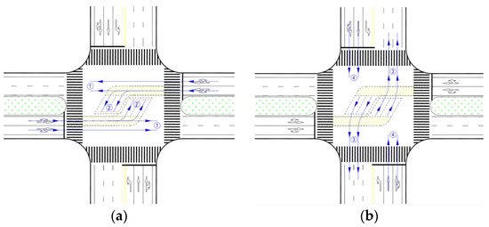 Figure 2. Release method of the left-turn vehicles of the through and left-turn shared lanes. (a) Drive into LWA, (b) Drive out of LWA.
