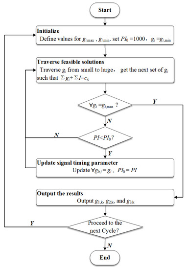 Learning from the optimization methods of adaptive signal control [29,30], the optimal timing plans per cycle can be decomposed by calculating the optimal green time of each phase, respectively. When the green time of the phase i is optimized, the green times of other phases are temporarily replaced by the green times of the corresponding phases of the previous cycle. As gi,k is typically an integer in the time interval [gi,min, gi,max], a finite exhaustive can be used to solve the optimization problem of Formula (1) quickly. The solution procedure is shown in Figure 3.