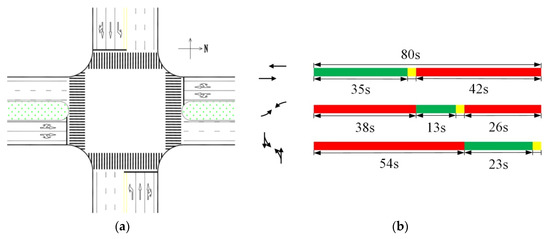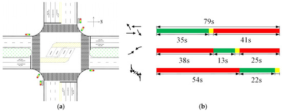 Figure 4. Current traffic organization of intersection. (a) Layout of intersection, (b) Current signal timing scheme.
