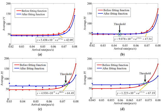 Figure 6. Average PI under different arrival rates. (a) One left-turn vehicle, (b) Two left-turn vehicles, (c) Three left-turn vehicles, (d) Four left-turn vehicles.